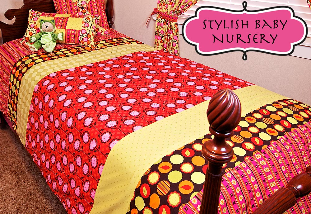 Having a small bed in the nursery is a luxury during the months when your baby doesn’t sleep through the night. For our Stylish Baby Nursery, the Sunny Horizons duvet uses bold stripes of several Andalucia fabrics to make a colorful covering with simple ties finishing off the bottom. When you collapse on it in exhaustion, you’ll feel so much better knowing it’s such a beautiful match to all the other items in the nursery.