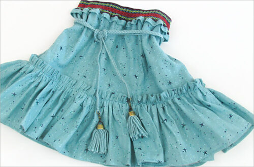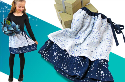 Is there a little girl in your life who needs a bit of party sparkle? Our sweet skirt features two layers of Metallic Double Gauze. We include a chart for sizing from 7 to 14. The panels are all simple straight cuts so itโs easy to adjust.