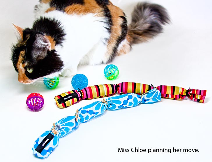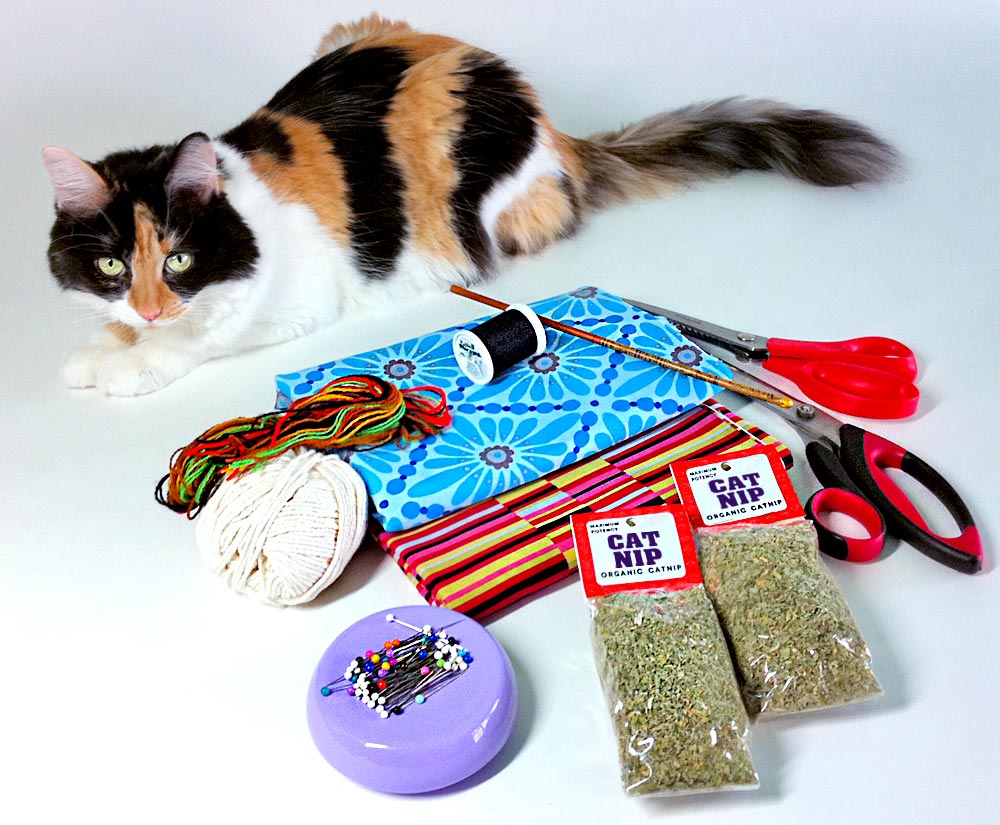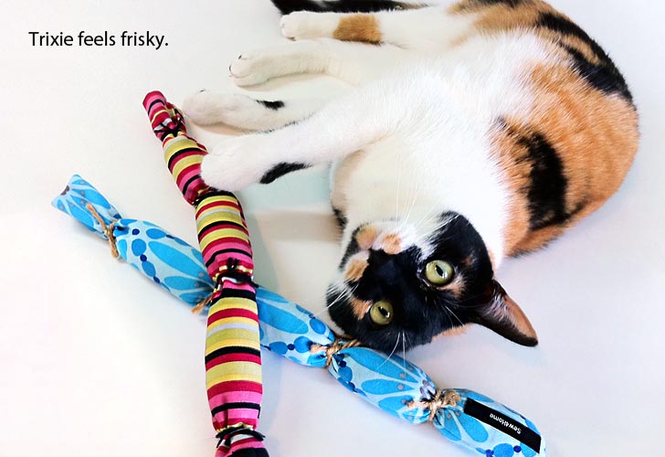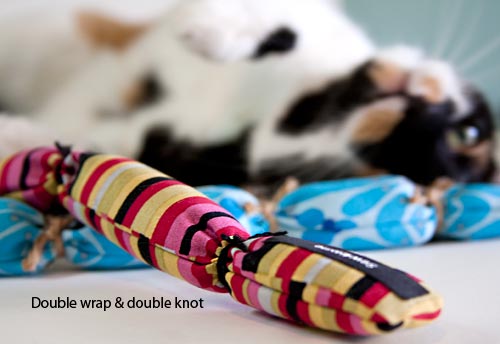 Just ONE seam is all the sewing required to make a Cattail Catnip Toy. Fill with catnip and tie into segments. Your kitty will lick it and pummel it with rapid-fire kicks in appreciation. Not every cat is into catnip, and kittens usually ignore it; but in a lifetime of living with cats, I’ve never had one who didn’t enjoy catnip playtime. The trick is to limit use to about once a week to avoid desensitization.
