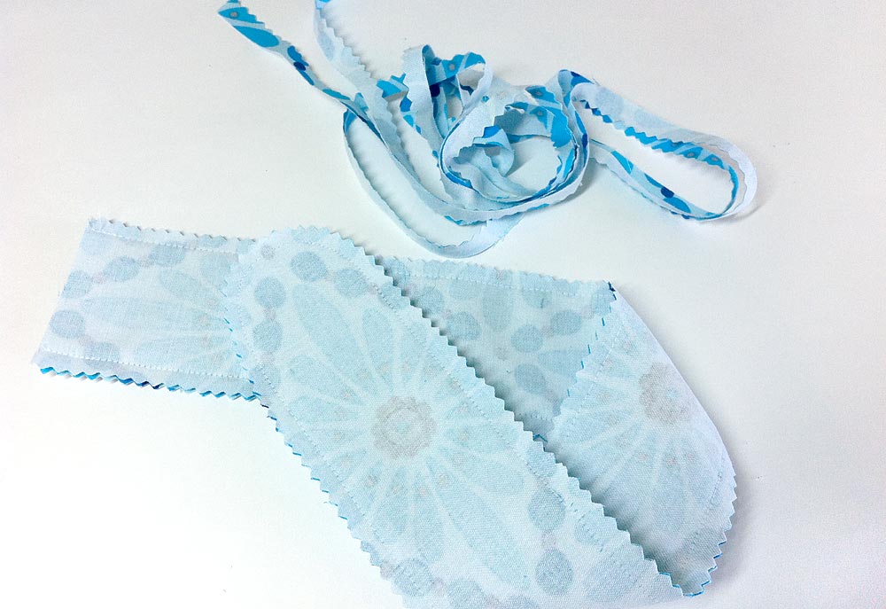 - Using a ½” seam allowance, stitch all around leaving the end open as shown on the pattern piece. Trim seam allowance to approximately ¼” using pinking shears (or scissors) as shown: