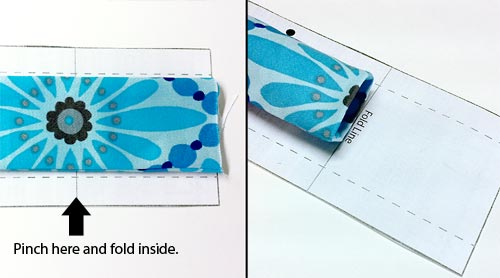 - Place on pattern piece to find fold line. Pinch either side and fold the raw ends to the inside. You can smooth the fabric inside using your chopstick.
