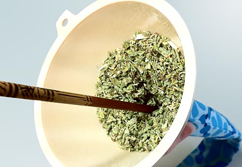 - Fill with 1¼ cup of catnip. A large funnel makes this step easier. Use your chopstick to poke the catnip through the funnel.