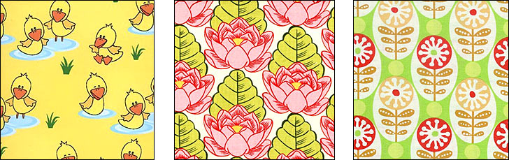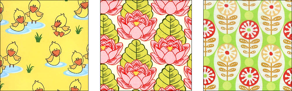 - If your fabric has a one-way design, lay all of your pattern pieces in the same direction, with your finished project in mind. For example, you don’t want to make curtains for the nursery with upside-down ducks. One-way designs can be very subtle so look carefully. All three fabrics shown below have one-way designs.