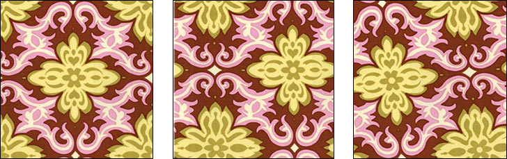 - If your fabric has a large-scale design, think about where on the design to place pattern pieces. For example, if you are making a throw pillow and you want the spectacular flower design square in the middle of the pillow, place your pattern piece appropriately. That means you probably need extra fabric so you have the luxury of placing pieces on specific areas of the fabric design. It’s so worth it. In the photos below, the first block would make a striking pillow. The middle block shows a random not-so-striking placement. The third block shows what happens when you don’t place pattern pieces on the grainline.