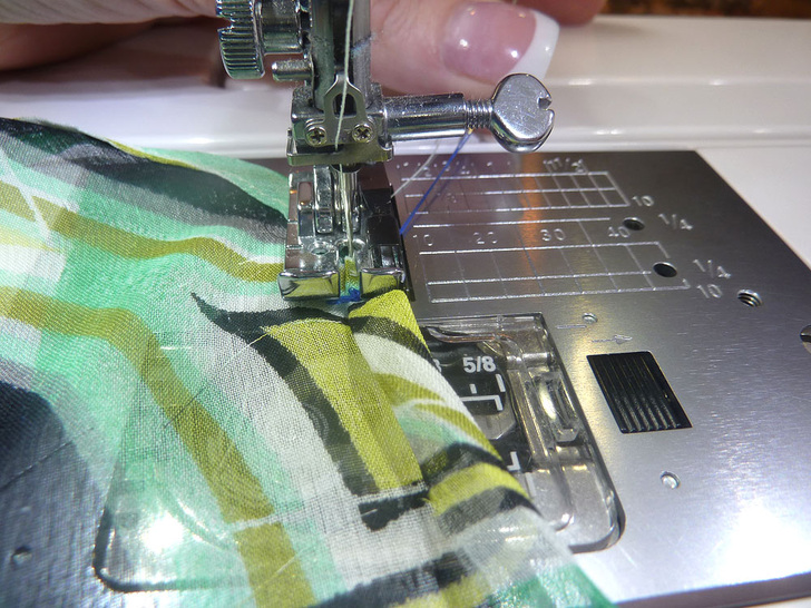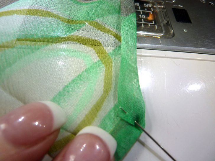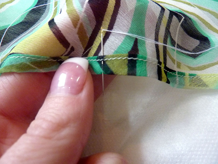- Place the hem under the foot and hold on to the hand sewn thread tails as you start to sew, gently pulling the hem towards the back. This helps prevent the fine chiffon from bunching under the needle.