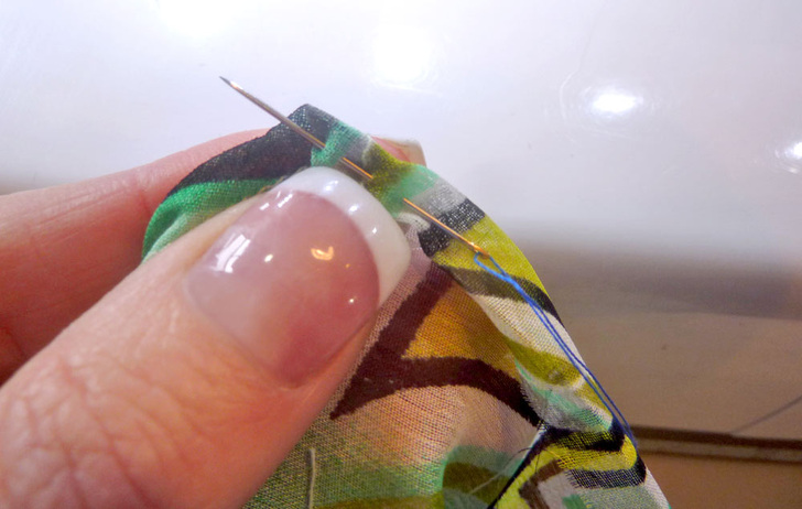 - Leave a long tail. Tie the tails in a double knot and cut close, hiding your knot behind the hem.