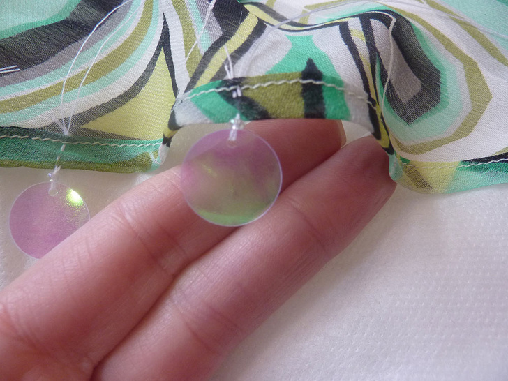 - To sew a paillette in place, first pull the thread through the rolled hem.