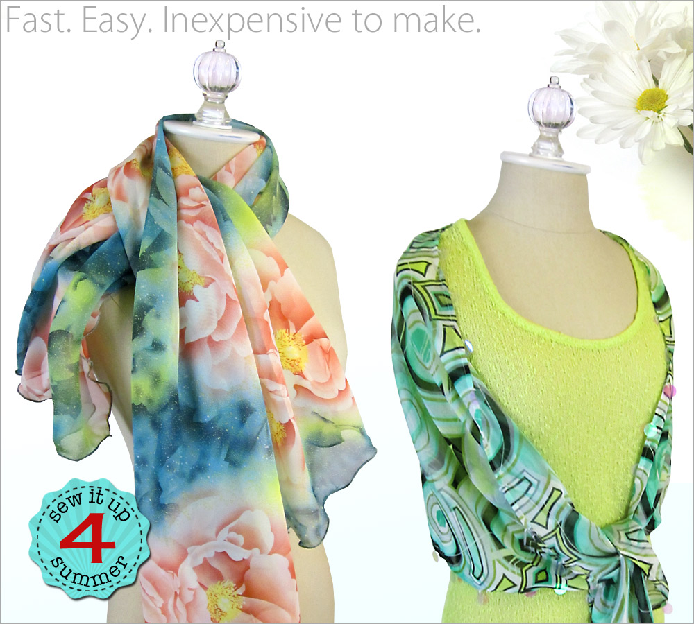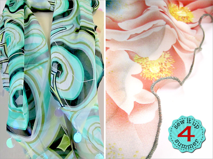 A great scarf can elevate an outfit from drab to dynamic in an instant. However, really nice scarves don’t come cheap at the department store or boutique. Here’s a little fashion secret: scarves are SUPER easy to make, and you can find amazing selections of the ultimate scarf fabric: chiffon for as low as $4.00 a yard! We have two designs for you to try. If you have a serger, cut on the bias and create a ripply “lettuce edge” all around. For your sewing machine, go long and lovely with a rolled hem and hand sewn sequins all around.
