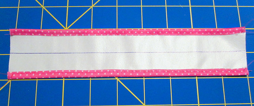 NOTE: We used all pink snaps for our Sassy Cheetah case but went with a variety of snap colors for our Little Monsters case. - Find the two 4″ x 15″ handle strips. Place each strip wrong side up and flat on your work surface. Use your ruler to draw a line down the exact center of each strip.