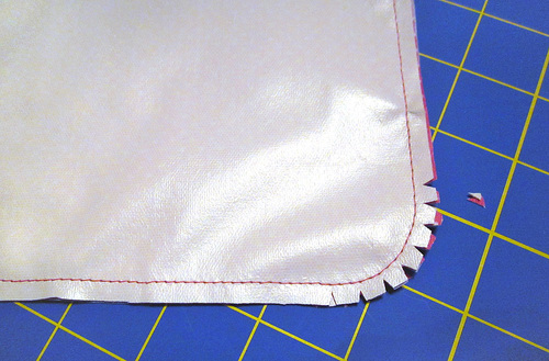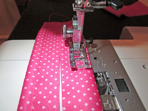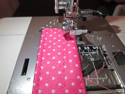 - Re-threading as necessary, and keeping a slightly lengthened stitch, edgestitch around the entire perimeter of the handle, pivoting at all four corners.
