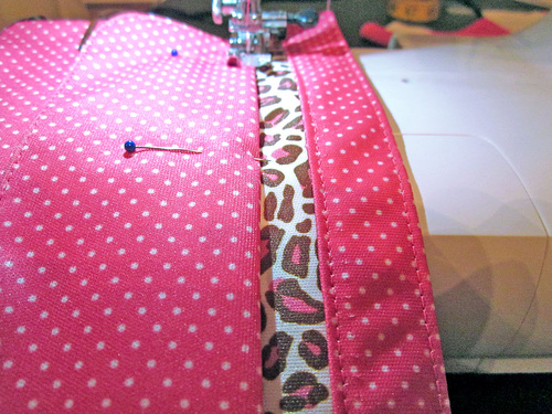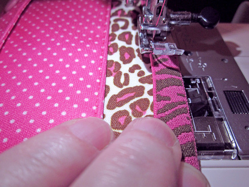 - Starting along one side at the top of the pocket binding, wrap the fold over elastic around the raw edges of the panels.