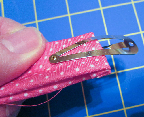 - Fold back each end of the basted strip ¼”, then fold the entire strip in half. Clip in place.