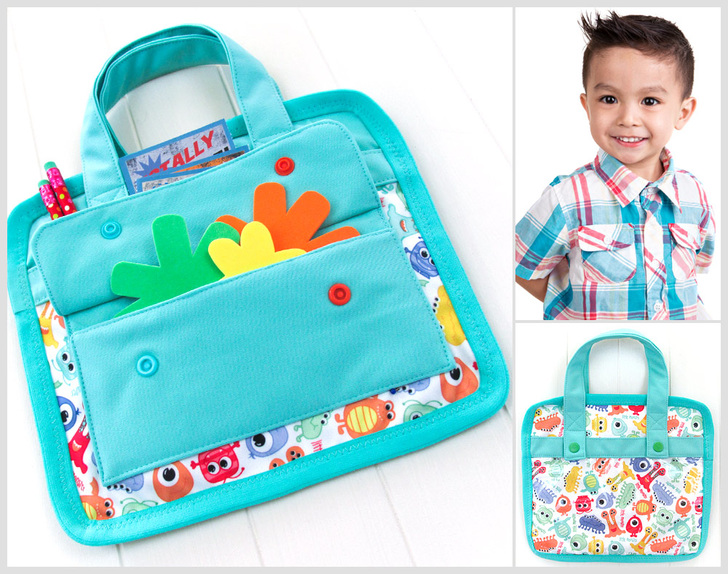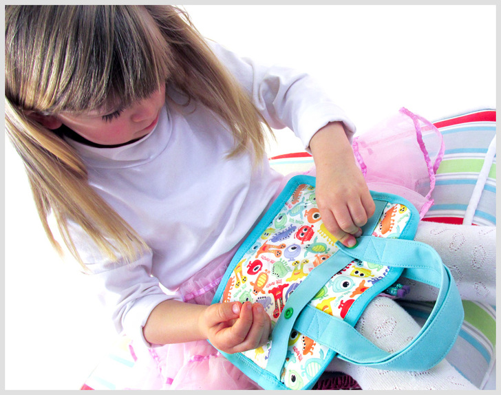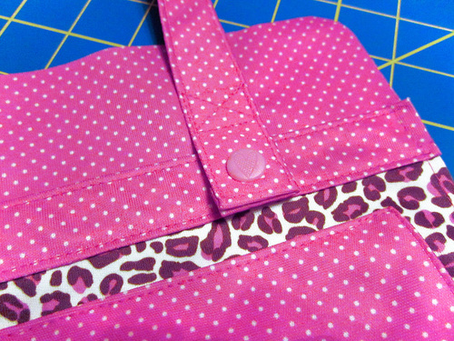 All three pockets snap closed with plastic snaps. This was a favorite of our little model, who spent her time opening and closing the pockets over and over… and over. When our models have a hard time giving up the samples at the end of the shoot, we know we have a winner on our hands. If you are new to working with these cute snaps, we have a full tutorial.
