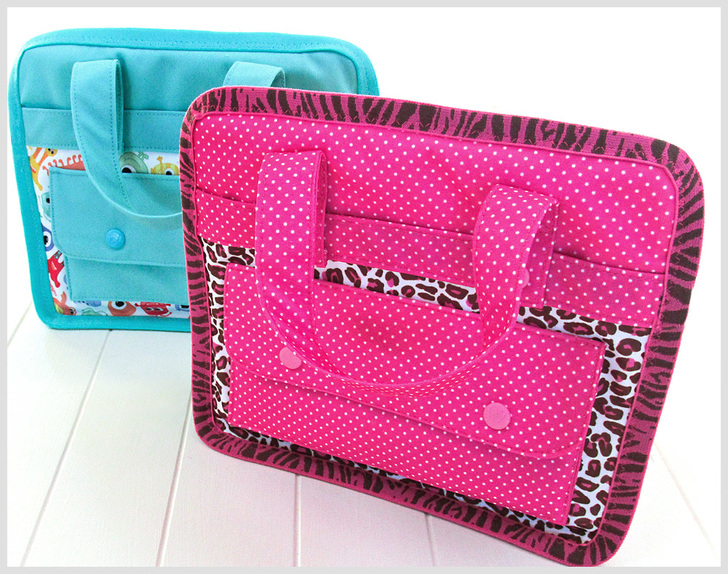 The minimum combo for each case is TWO coordinating fabrics, but you could certainly up that to three fabrics: one for the front panel, a second for the outer pocket panel, and a third for the back panel, folded pocket, pocket trim, and handles.