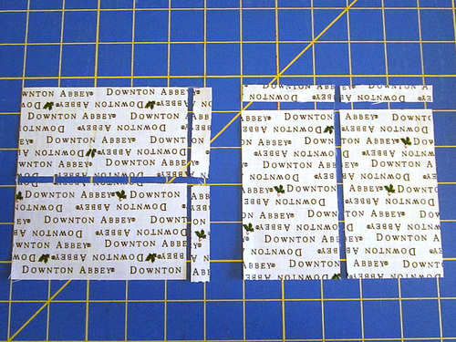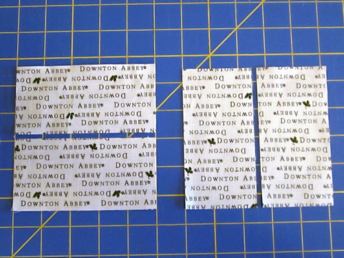 - Repeat these steps to create a total of TWENTY-FOUR half square triangles. Separate them into two stacks: one with the script oriented vertically and one with the script oriented horizontally.