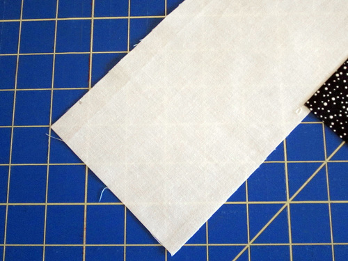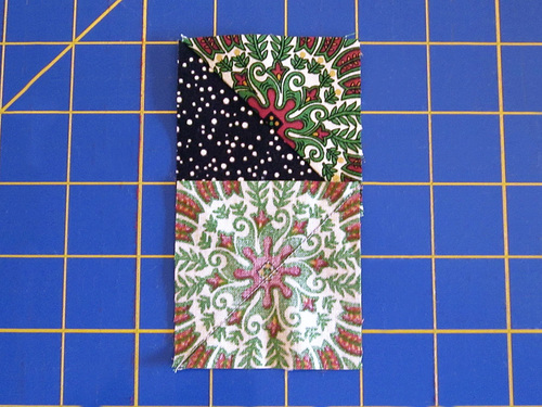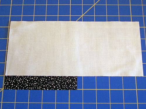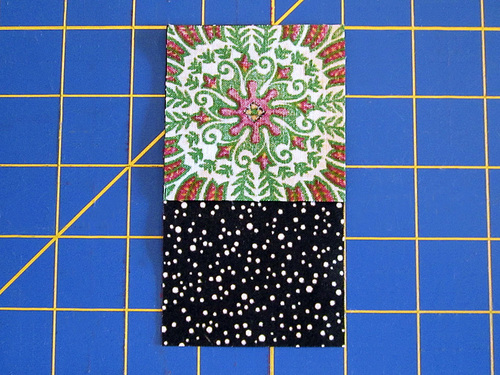 - Place a 10½” x 4½” solid rectangle right sides together with a patterned square, keeping one side and the top edge flush.