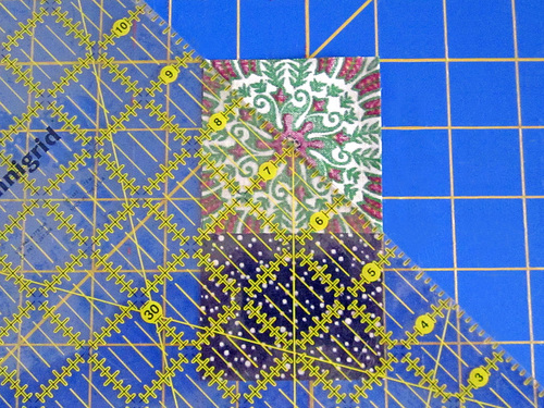 - Using the 2½” fussy cut ruler, trim each half square unit down to an exact 2½” x 2½” square. You will be trimming off just a tiny amount.