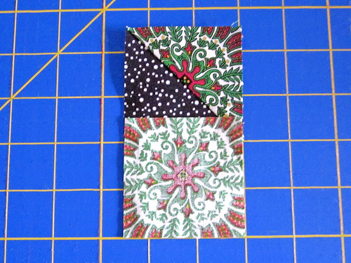 - Along the bottom, sew an inset triangle to the block. Press the seam toward the strip.