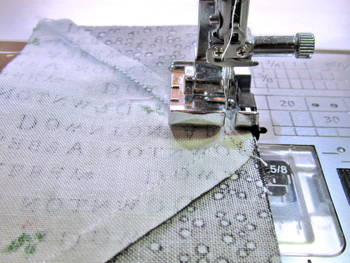- Using a ¼” seam allowance stitch from the overlapped corner to the outer side edge of the square only.