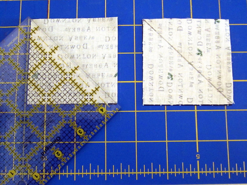 - When both seams are sewn, cut along the drawn line to produce two half square units.