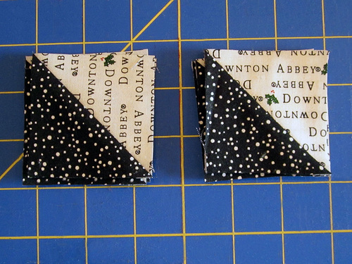 - Press the squares open, pressing the seam allowance toward the darker fabric (Snow in black).