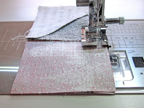 - Using a ¼” seam allowance stitch along the top edge of the square only.