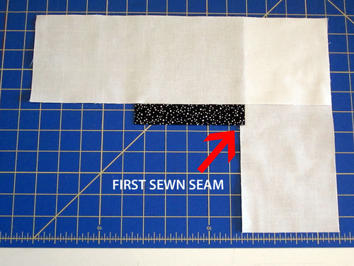 - At the raw edge of the opposite longer side, sew a longer strip unit, again carefully matching the seams. Press the seam allowance toward the strip.