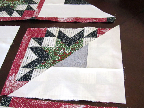 - Place an inset triangle right sides together with one raw side edge and one sashed edge of the block as shown in the photo below.
