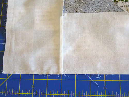 - Place one square right sides together with one end of a rectangle, aligning the 2½” sides.