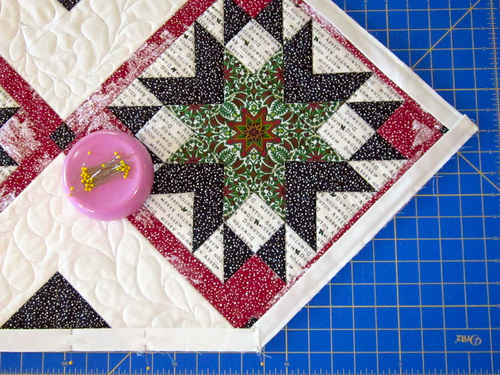 - Start in the middle of one long edge, leaving a tail of approximately 4″. Sew the binding to the runner, using a ¼” seam allowance.