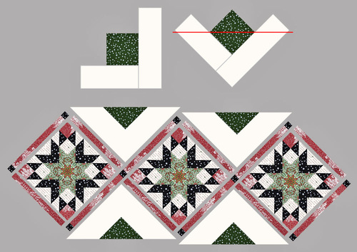 - Arrange the star blocks, inserting the triangle and sashing strips as shown in diagram below. The arrangement is easiest sewn as diagonal rows. All seam allowances are ¼”.