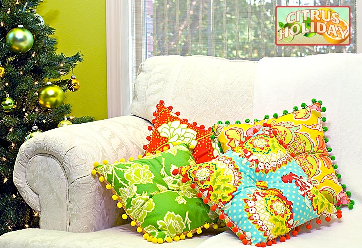 Our Citrus Holiday designs were made using Heather Bailey’s delightful Pop Garden & Bijoux Collection. To learn more about how we created this non-traditional holiday palette, read our article: Citrus Holiday: A Lighthearted Living Room.