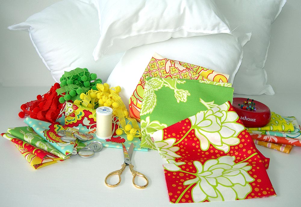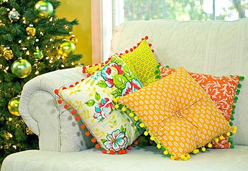 - Pom-pom trim in coordinating colors to fabrics: 1¾ yards PER PILLOW: we used a 1″ pom-pom in orange (A and D), gold (B), and green (C). Note: For our sample, you actually need 54″ per pillow, which is exactly 1½ yards, but it’s better to have a bit to spare – just in case there’s a horrible pom pom accident; you never know.