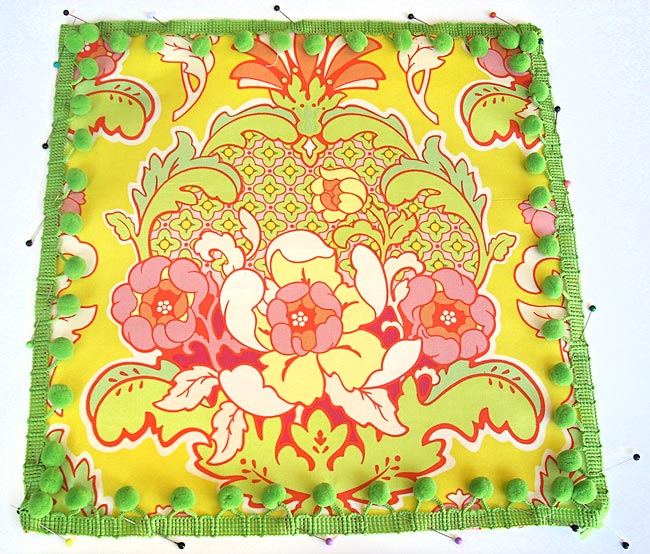 - Secure the trim in place with a hand or machine basting stitch. If using your machine, choose the zipper foot, which will allow you to stitch closer to the edge. A basting stitch insures your trim won’t slip and slide when you’re sewing your final seam. You can simply pin it in place as well, sandwiching it between the two fabric squares, but it’s a bit harder to control. As with all fringe-type trims, remember these rules: your fringe goes in between the two fabric layers, the raw edges of the fabric and the fringe are even, and whatever dangles from the fringe, in this case pom poms, is falling towards the middle of the pillow.