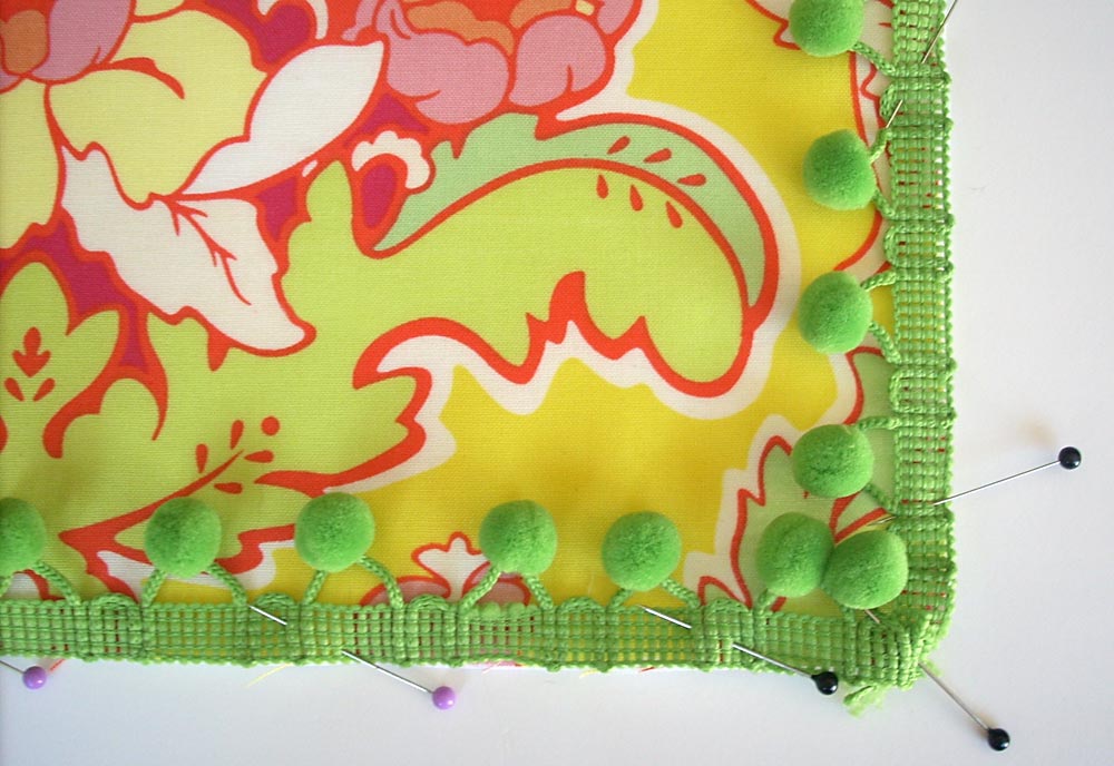 - With pom pom fringe, it’s a good idea to start and finish at a corner. Start pinning, leaving about a 1″ tail. Keeping your trim and fabric edges even, continue all around the perimeter of the pillow.
