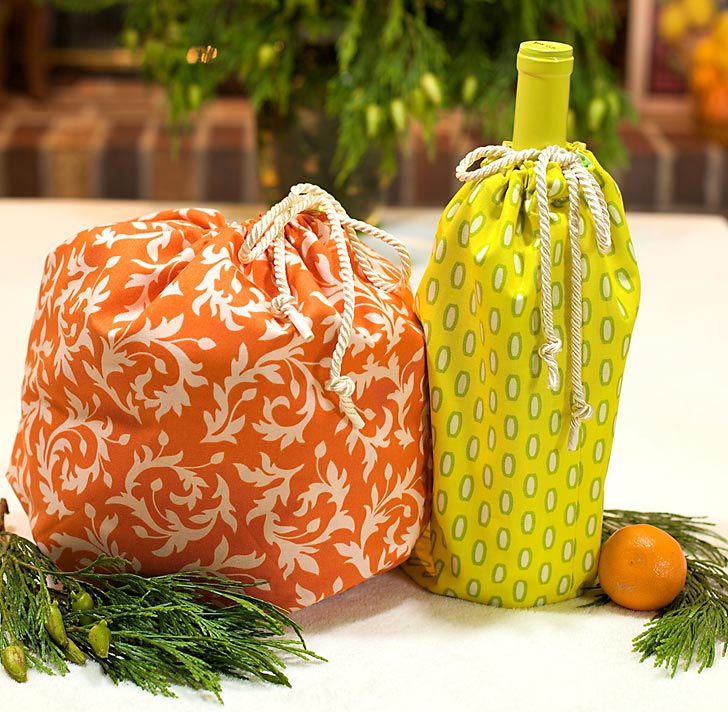 We all know how it goes. In the fall, we make a resolution to give only handmade gifts for the holiday season. Then, December rolls around, and you don’t have the tree up, you have a full queue of holiday parties to attend, and the kids are begging to make cookies all weekend. That’s where our handmade Gift & Wine Bags come in. They’re quick to sew, and can at least add a homemade touch to those last-minute purchased presents. Plus, they’re re-usable,which means they’re a green alternative to wrapping paper.