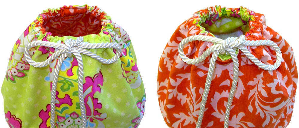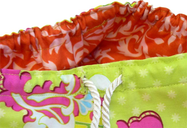 Our bag is designed to have a defined inside and outside, and the drawstring comes out through buttonholes along the top of the outside of the bag. This makes the bag very easy to construct. But does it make the bag truly reversible as the name implies? The Grand Gift Bag Judge might say no, because the buttonholes are only on one side. But we took it all the way to the Gift Bag Supreme Court, and the consensus was: because all the seams are hidden and the drawstring is at the very top, the bag could indeed be considered fully reversible. Compare the photos above and below; we think you’ll agree the bag looks dandy inside and out.