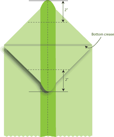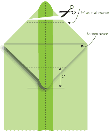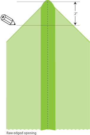 - Measure 2″ down from the top tip of the triangle and use your fabric pencil to draw a line straight across the folded fabric.