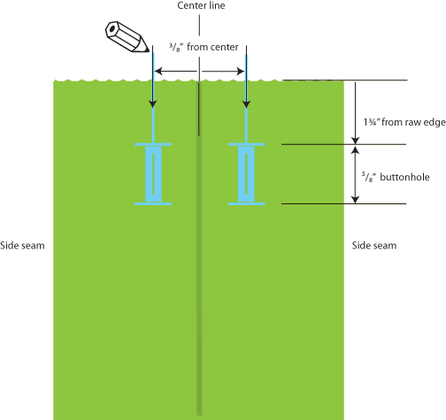 - Using the fabric marking pencil, sketch two 5/8″ buttonholes on the fabric to use as guides when you are stitching your buttonholes.
