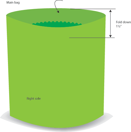 - With the right side facing out on the main bag, turn in raw edge 1½” all around the top. Press in place.