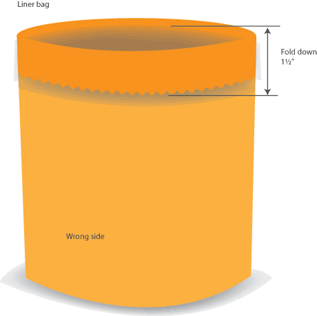 - Turn the liner bag inside out, and with the wrong side facing out, turn out raw edge 1½” all around the top. Press in place.