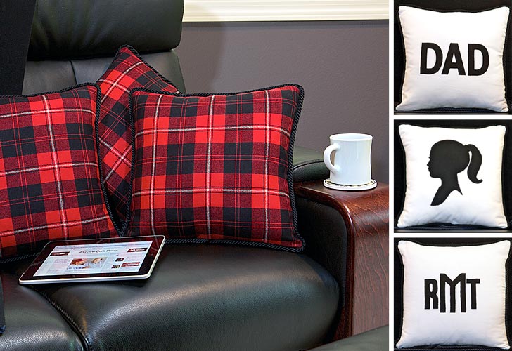 Commemorate Dad’s day with a set of cool plaid pillows featuring appliqués that celebrate his family, his interests, or simply his name. We used a classic red plaid from Pendleton for the back of each of our pillows, white cotton duck for the fronts, twisted cording around the edges, and black felted wool for our appliqués to create the look of vintage shadow silhouettes. The only thing missing is an Irish Setter at Dad’s feet and leather patches on his jacket sleeves.