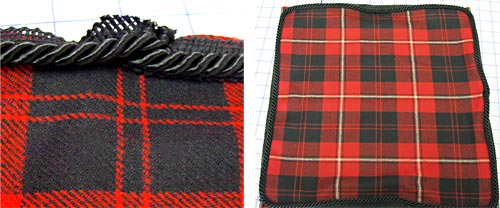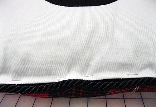 - Pin the twisted cord to the right side of the back fabric square (the plaid in our sample). Start in the center of one side (the bottom edge if you have a directional fabric) and line up the edge of the cord’s insertion lip with the raw edge of the fabric.