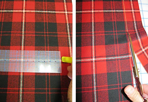 IMPORTANT: Each template page is ONE 8.5″ x 11″ sheet. You must print the PDF file at 100%. DO NOT SCALE to fit the page. - For each pillow back, measure a 16″ x 16″ square and mark the cutting lines on your fabric with your fabric pen or pencil. We used the Pendleton Cunningham plaid, so we fussy cut to make sure we centered the lines of the plaid in the square. Cut out each square.