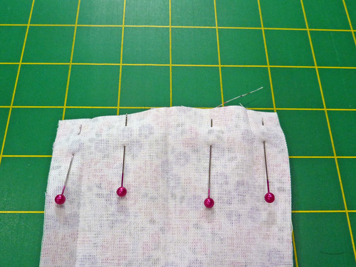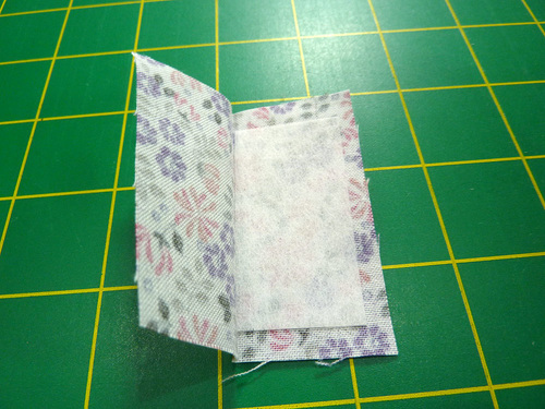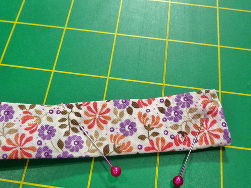 - Fold each handle strip in half, right sides together. Pin along the long side. Both ends are raw and open.