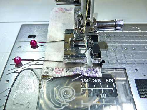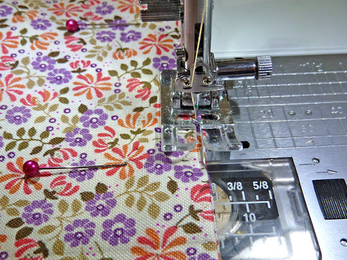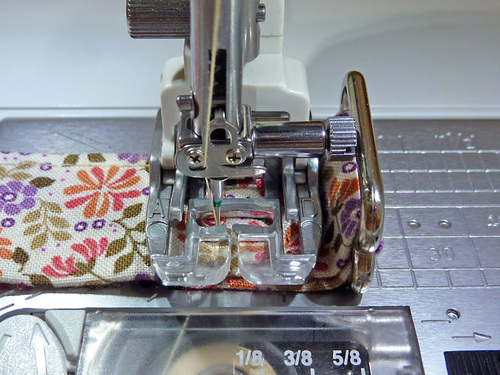 - Using a ¼” seam allowance (we used our Janome Quarter Inch Seam foot), stitch both sides and across the bottom through all the layers.