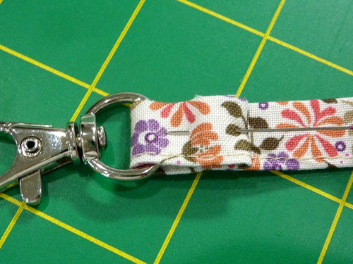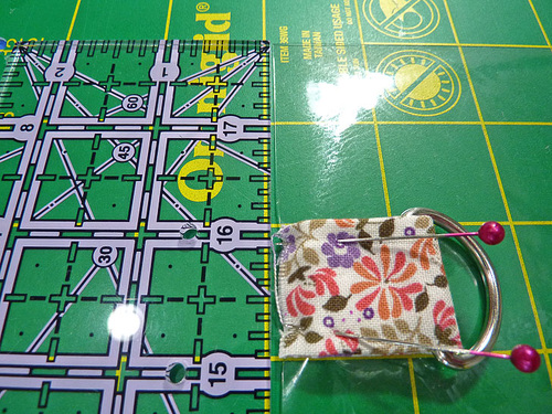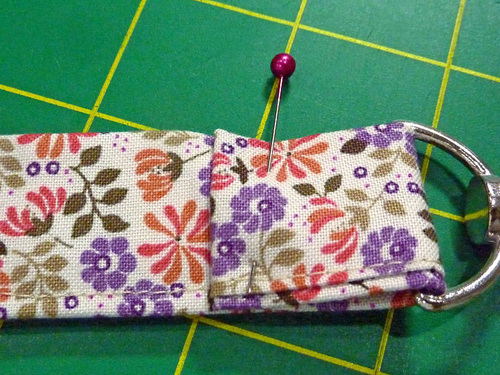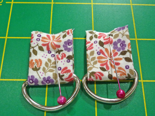 - Slip a tab through each D-Ring, pulling it through so the raw ends are flush. Pin together the raw ends.