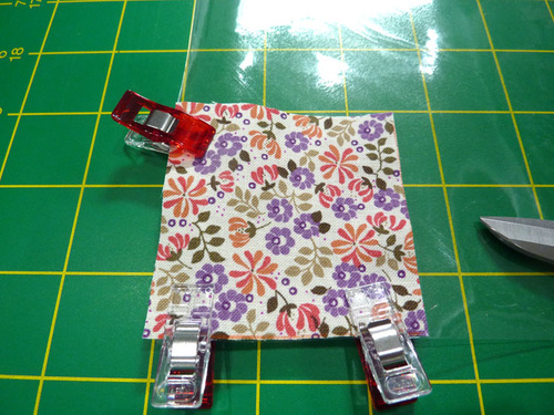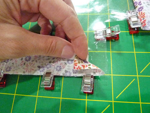 - Place the binding strip across the raw edges of the flattened corner. Each folded end should be flush with the outer edges of the flattened corner and, as above, the unfolded raw edge of the binding strip is flush with the raw edges of the vinyl. Clip in place.