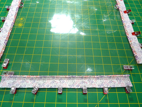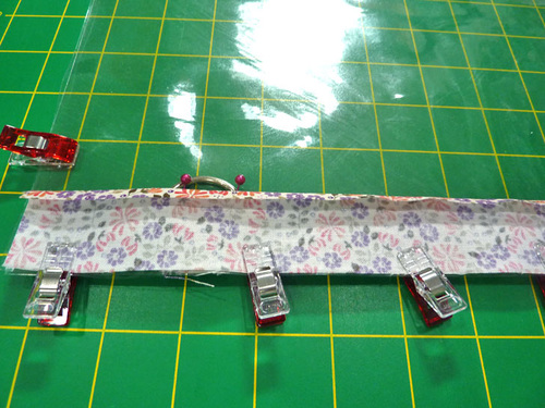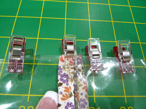 - Place a binding length right side down along one side, aligning the unfolded raw edge of the binding strip with the raw edges of the vinyl. Clip in place.