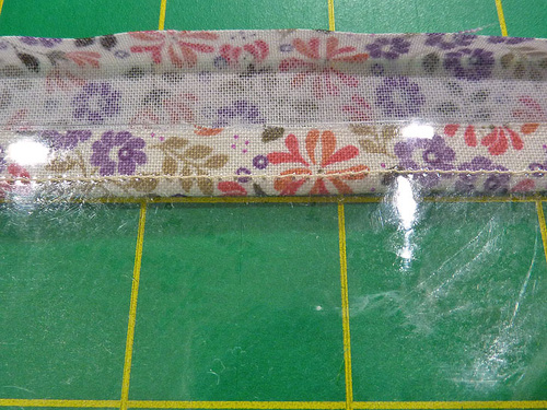 - Find the 1½” strip(s) of binding. Cut lengths to fit the two sides and the bottom of the layered vinyl panels.